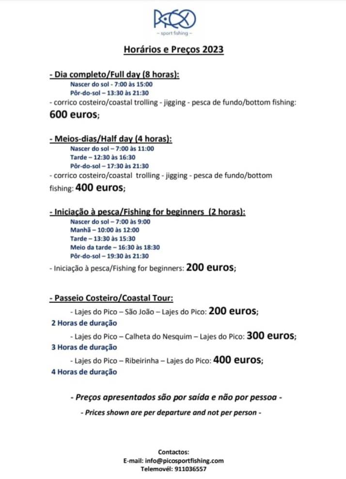 Discover the thrill of deep water with Pico Sport Fishing!Whether you're a fishing enthusiast or just curious looking for water adventures, Pico Sport Fishing is your gateway to a unique experience in the Atlantic Ocean. Located on the stunning island of Pico, in the Azores, you will have the opportunity to explore the rich and abundant waters that surround this region! With Pico Sport Fishing, you will have access to a fleet of modern and comfortable boats, equipped with the best fishing equipment and driven by experienced and knowledgeable captains. From inshore fishing to deep sea fishing, there are options for all skill levels and preferences! On board, you will be welcomed by a dedicated and passionate team, ready to make your fishing experience unforgettable! Expert guides will share their knowledge of the best techniques and strategies to ensure you have the best chance of success! If you are a fishing enthusiast looking for an exciting experience or a born explorer and want to live new emotions, Pico Sport Fishing is the ideal option for you! Don't miss the opportunity to explore the clear and stunning waters of the Azores, while creating lasting memories and sharing epic fishing stories! |